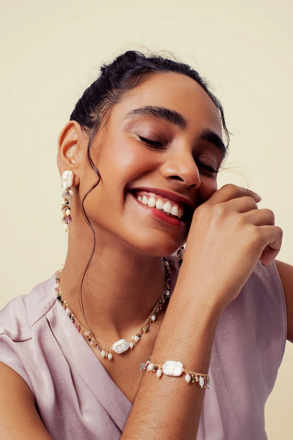 Elegante e delicada, combina pérolas naturais com a energia equilibrante da turmalina. Uma peça versátil para trazer charme e serenidade ao visual.