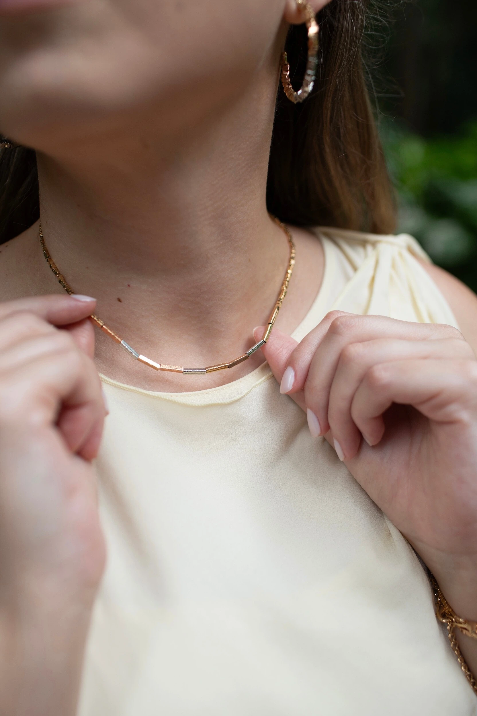 Colar curto com design fluido e delicado, perfeito para complementar seu estilo.