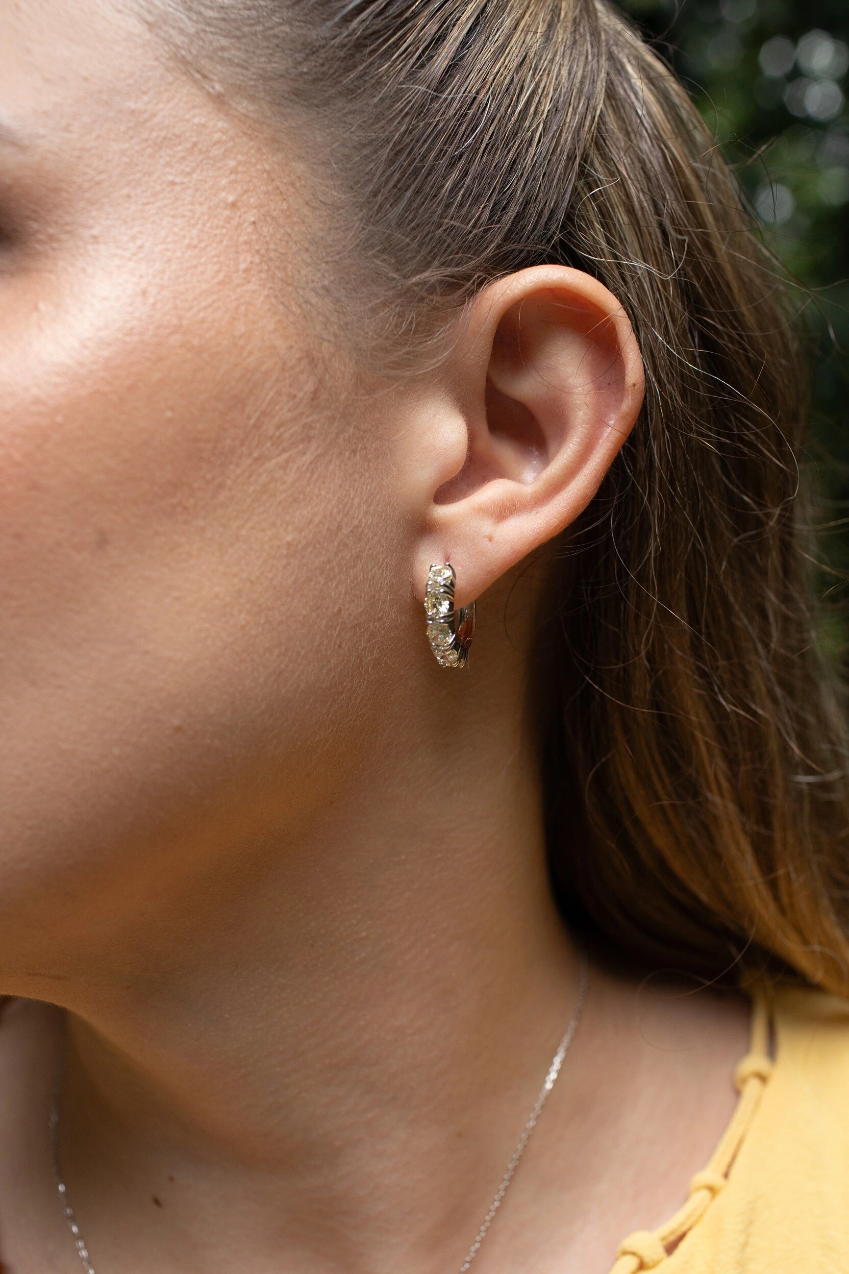 Argola com pedras amarelas que criam um brilho contínuo e elegante. Moderna, leve e perfeita para o uso diário.